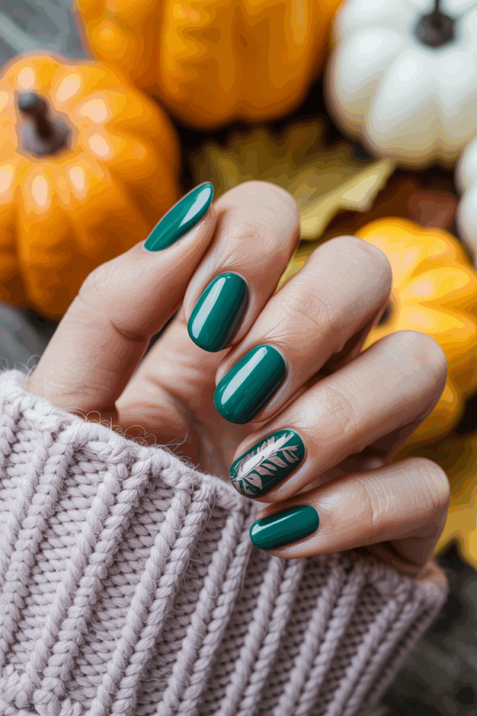 Emerald nails add a jewel-toned luxury to your autumn manicure. The bold green shade is chic, festive, and stands out beautifully in October and November.