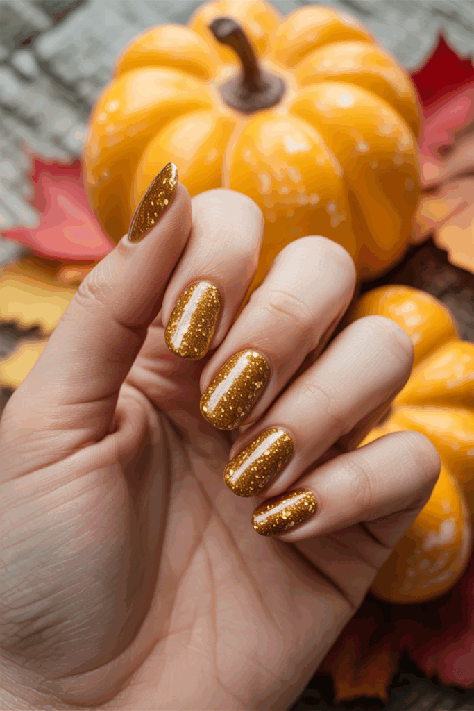 Gold glitter nails sparkle like autumn leaves catching the sunlight. They’re festive, glamorous, and versatile enough for both October and Thanksgiving celebrations.