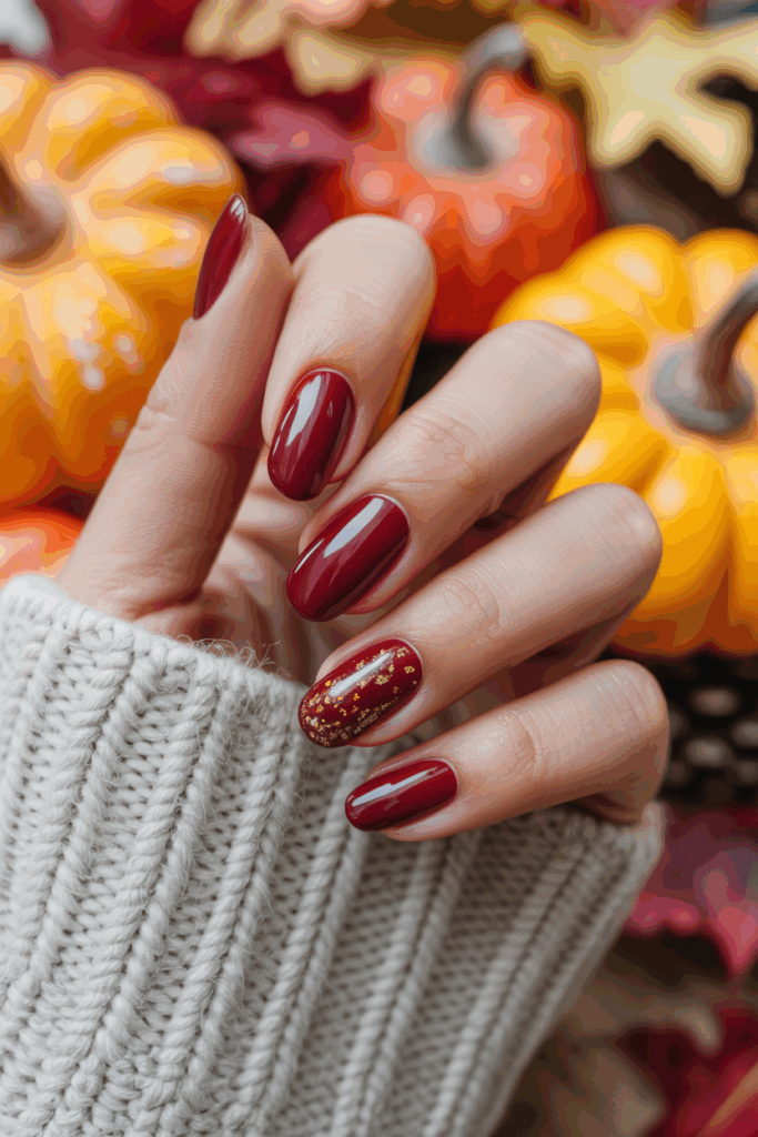 For an extra seasonal touch, pair burgundy nails with gold jewelry or accent nails in metallic foil. This pairing instantly elevates your manicure into something chic and festive.