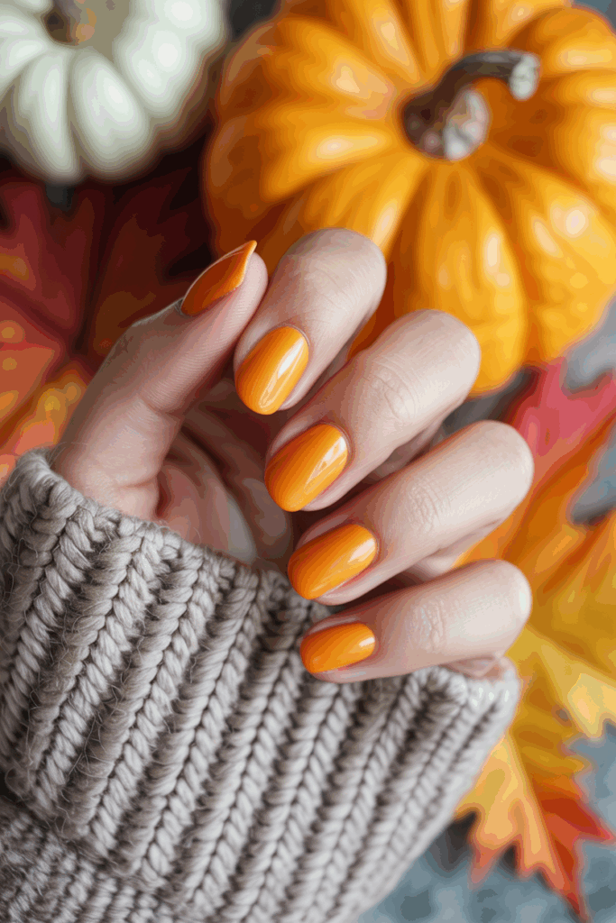 Pumpkin spice nails capture the warmth of fall and bring a festive feel to your manicure. The bold orange hue is cozy yet eye-catching, making it a favorite for autumn.