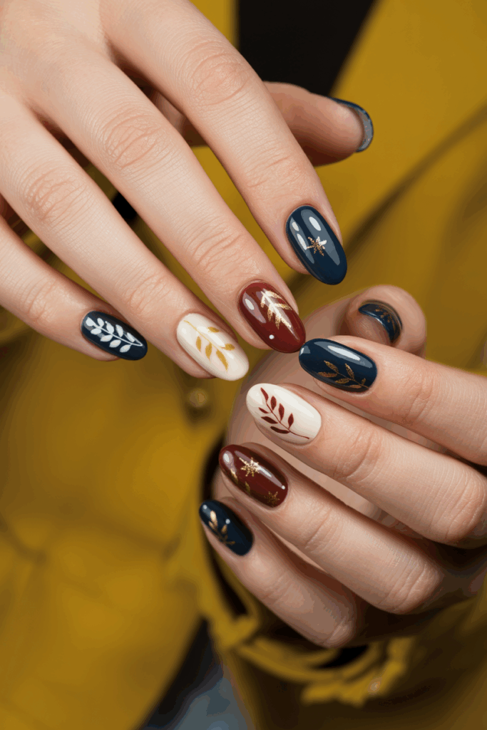 This design uses a rich burgundy base that fits well with fall colors. Gold foil accents add a subtle shine and a touch of elegance. The gold pieces are usually small and placed carefully for a delicate look. This combination works for both matte and glossy finishes.
