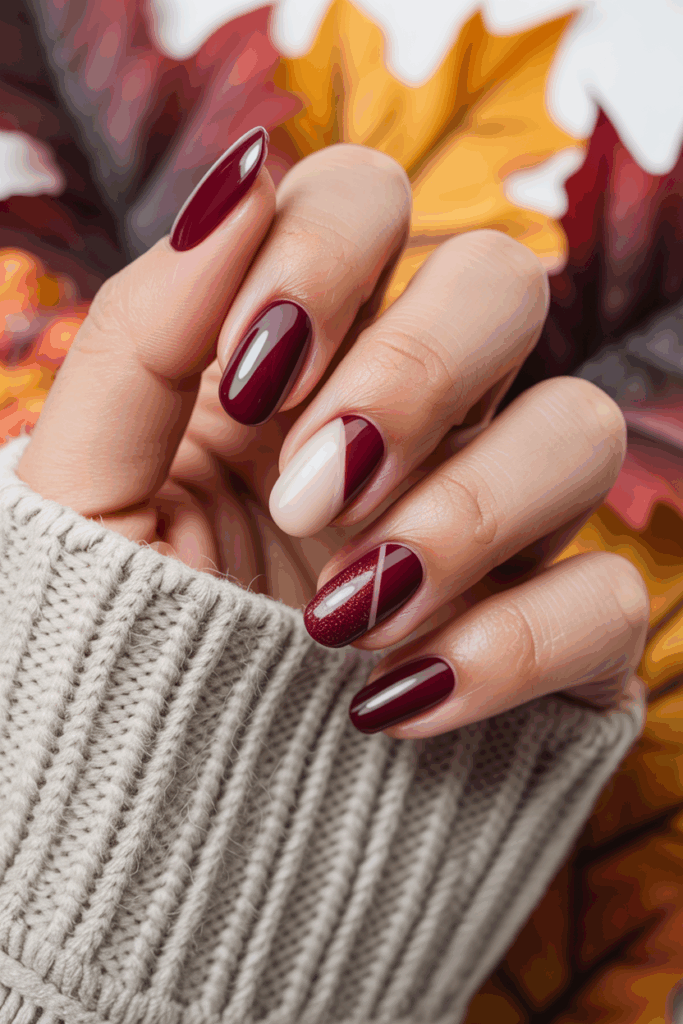 A burgundy and nude split design offers a chic twist on fall color palettes. One half of the nail is painted in a deep, wine-like burgundy while the other half is kept soft and neutral with a nude polish. The contrast between the bold and the subtle makes this style stand out.