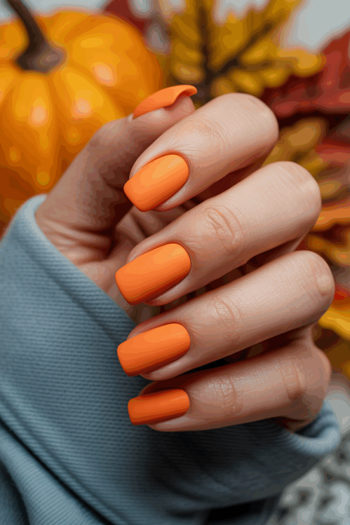 This design features a matte finish in a rich pumpkin orange shade. It captures the essence of fall with a simple, elegant look.