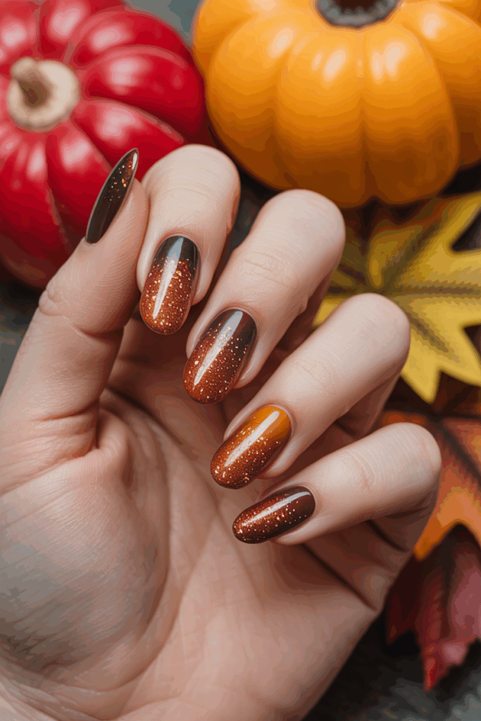 This design uses copper glitter to create a smooth gradient effect on the nails. The glitter starts denser at the tips and fades toward the base. It gives a warm, shiny look that fits well with fall colors. Copper shades work well for those who like subtle sparkle.