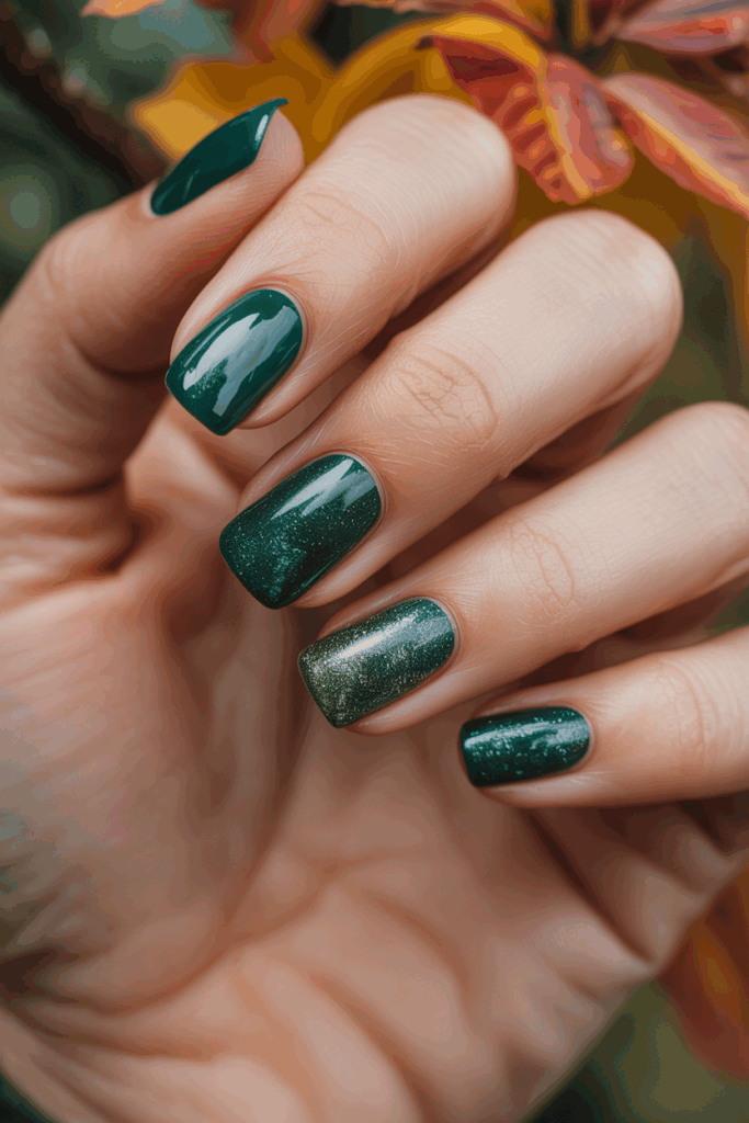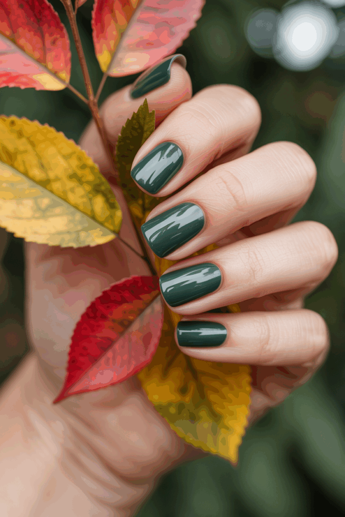 Glossy forest green works well for both short and long nails. It brings out the richness of fall’s natural colors and adds a dramatic yet elegant element to any outfit.
