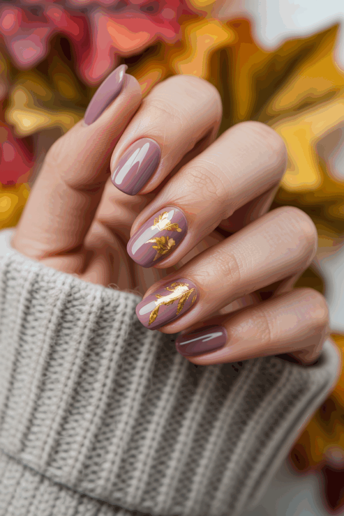 Adding gold leaf accents elevates the look with a touch of luxury. The irregular, organic shapes of the gold leaf stand out beautifully against the mauve base, creating a delicate yet eye-catching finish.