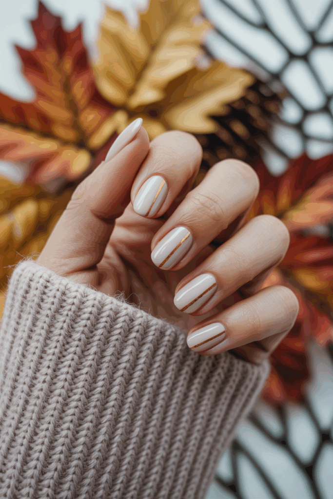 Neutral beige nails are timeless, but adding copper stripes transforms them into a modern fall look. The soft beige keeps the manicure polished and versatile, while thin metallic stripes bring warmth and dimension.
