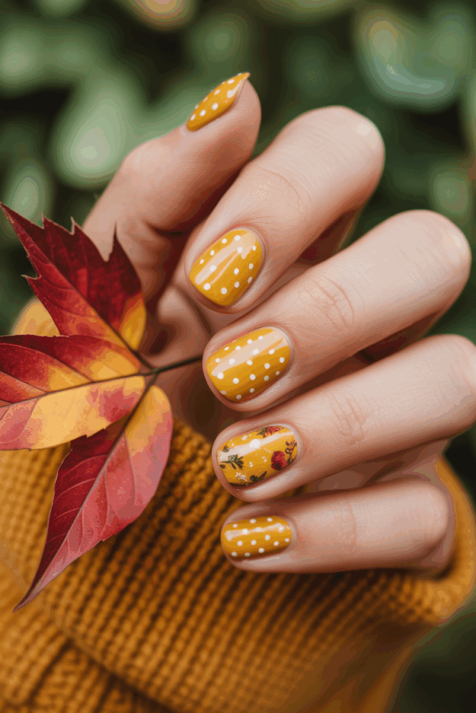 This design features a warm mustard yellow base that fits well with fall colors. Simple dots in contrasting shades add a playful touch without being over the top.