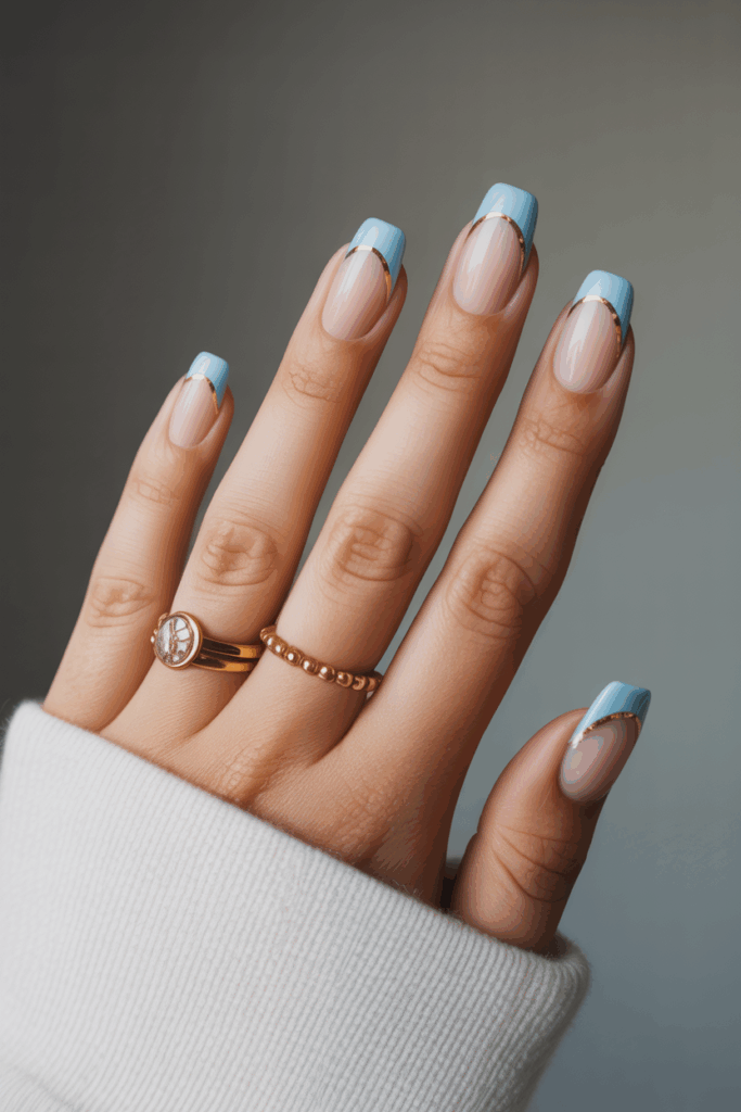 This style combines soft baby blue tips with a thin gold line along the edge. It adds a subtle shine without being too flashy. The gold trim highlights the blue, creating a balanced and elegant look.