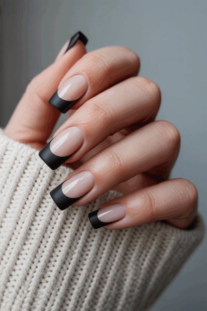 Black French tips with a matte topcoat offer a modern look. The matte finish reduces shine, making the black tips more subtle and refined. This style fits well with both casual and formal settings, giving nails a smooth, sleek appearance.