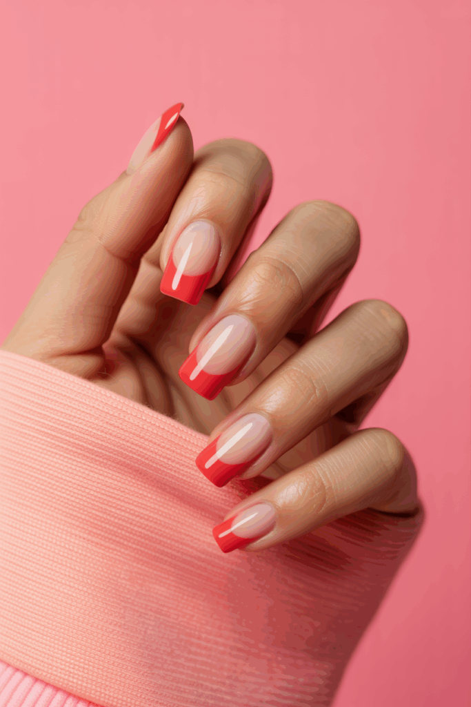 French tips with vibrant red hues add a fresh twist to the classic style. The bold color brings energy while keeping the design simple. This look works well on almond or coffin-shaped nails for a clean, modern finish.