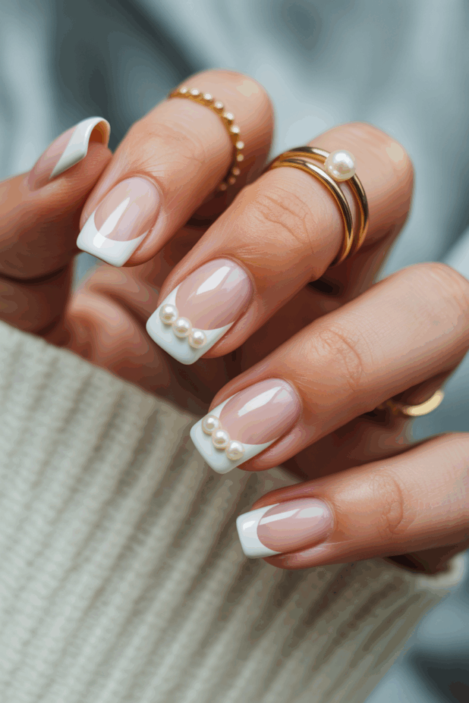 This style adds small pearl details to classic French tips. The pearls give a simple manicure a touch of elegance.