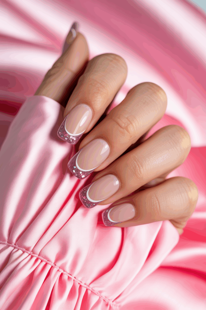 French tips with glitter outlines add a subtle sparkle to the classic look. The glitter traces the edge of the tip, giving a refined shine without overwhelming the nails.