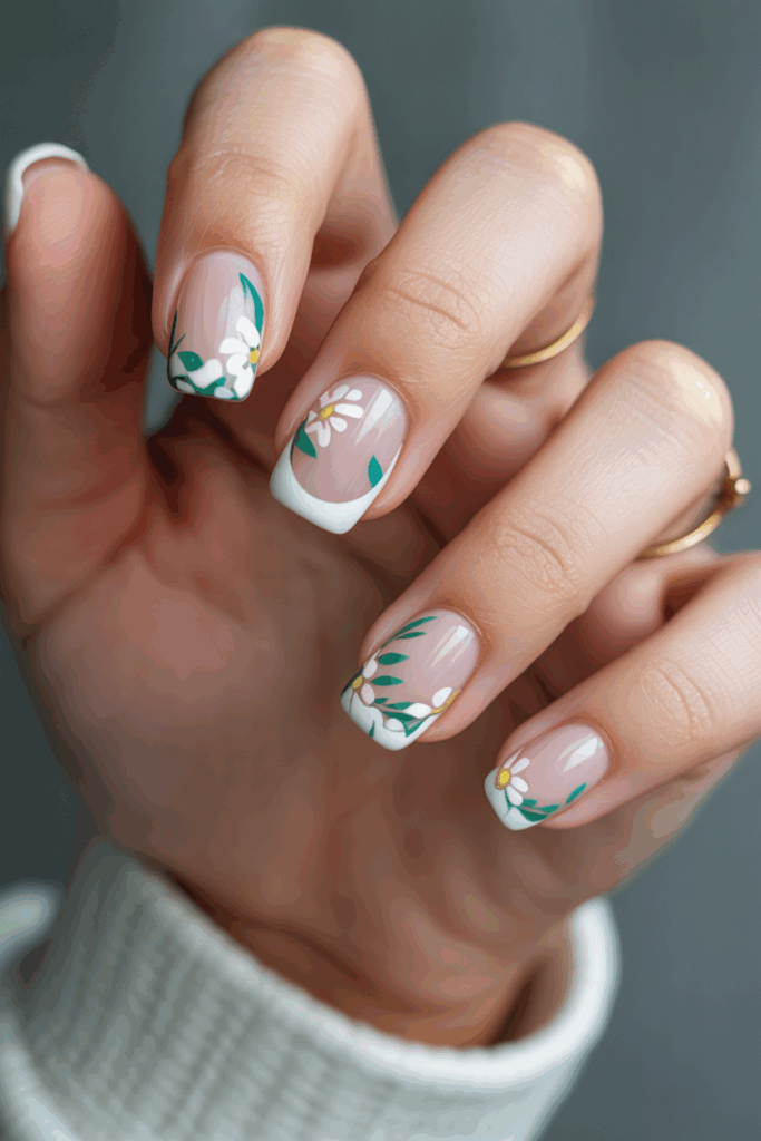 Short French tips with floral hand-painted details offer a fresh twist on the classic manicure. The white or colored tips are paired with delicate flower designs, often on one or two nails. This look adds charm without overwhelming the simplicity of short nails.