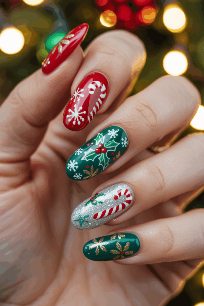 Festive holiday gel nails use classic seasonal colors like red, green, white, and gold. Designs often include snowflakes, candy canes, or reindeer for a cheerful look.