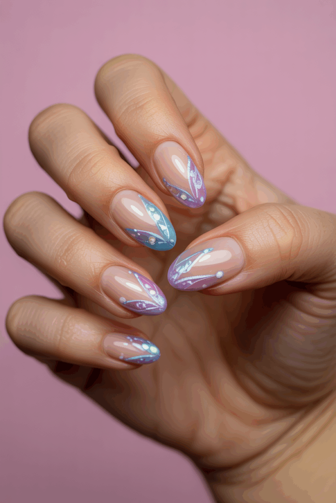 This design uses soft pastels and shimmering glitter to mimic delicate fairy wings. It often features light colors like lavender, pink, and blue with fine lines and sparkles. The look is subtle but adds a magical, whimsical touch to gel nails.
