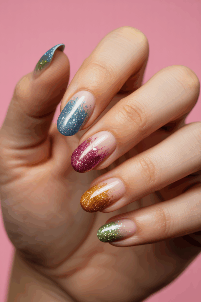 Glitter gradient gel nails feature a smooth fade of sparkles from the cuticle to the tip. This style adds a subtle shine or a bold sparkle, depending on the amount of glitter used. It works well for both casual and special occasions.