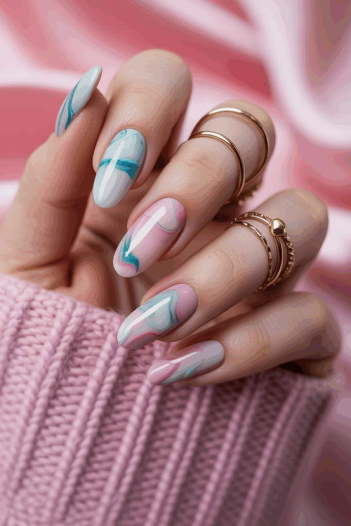 Marble effect gel nails use swirling patterns that look like natural marble stone. The design is created with gel polish because it lasts longer and stays shiny. It usually combines two or three colors for a smooth, elegant look.