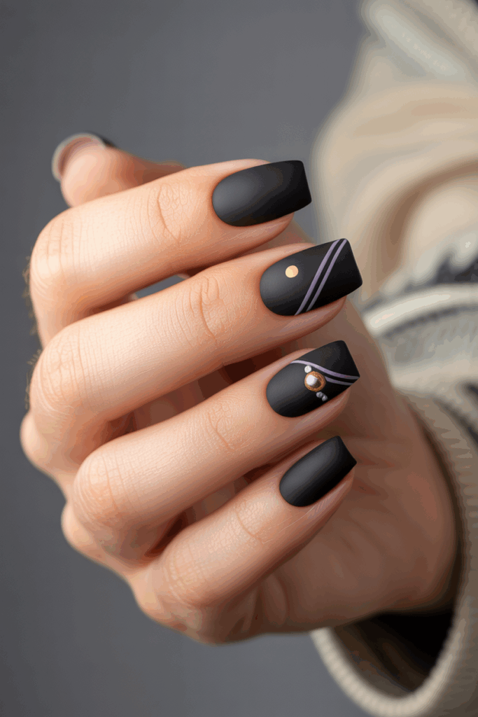Matte black gel nails create a sleek, modern base. Adding glossy accents gives the nails a nice contrast. These accents can be simple lines, dots, or small shapes to keep the look stylish without being too busy.