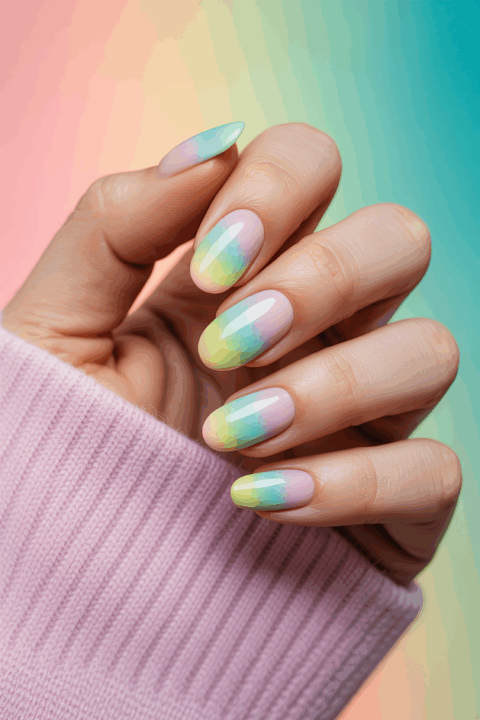 Pastel ombré gel nails blend soft colors for a smooth gradient effect. Shades like lavender, mint, and peach create a gentle, dreamy look. This style works well for spring and summer, offering a fresh and subtle manicure option.