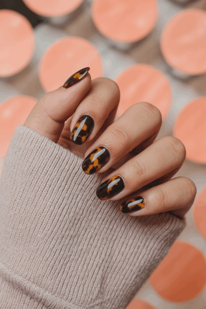The tortoiseshell gel nail design uses warm brown tones with a glossy finish. It creates a rich, natural look that suits fall and year-round styles. This design often mixes solid colors with patterned nails for a balanced, stylish effect.