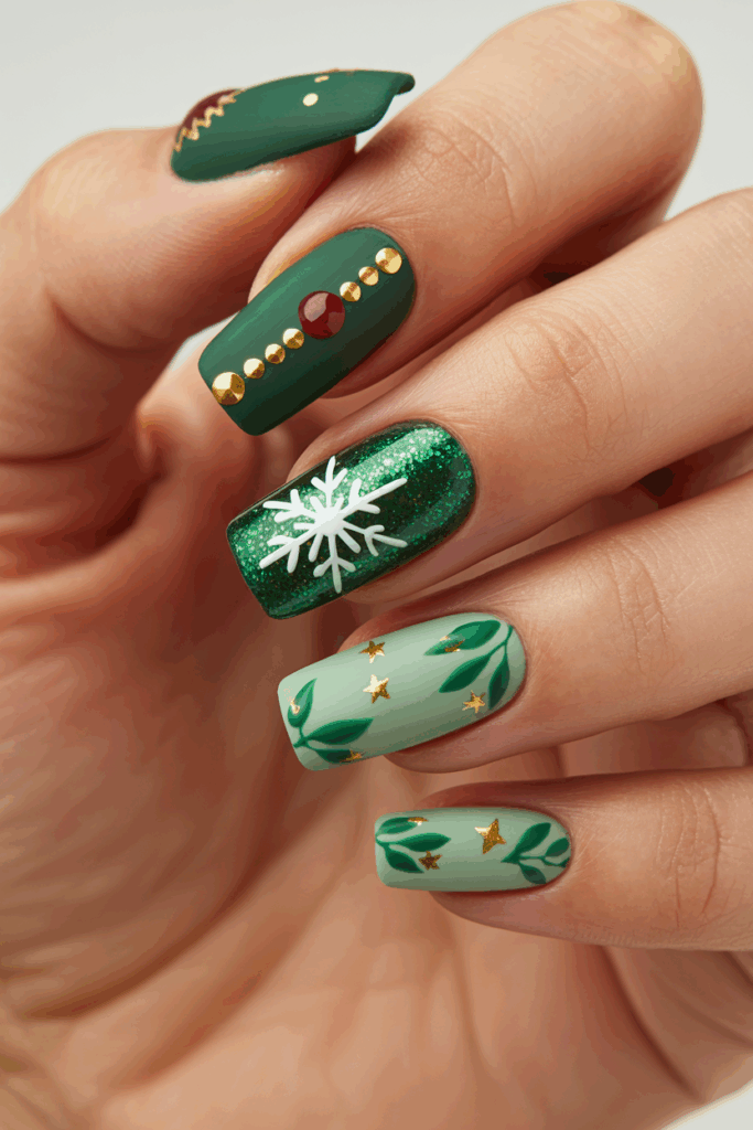 This design uses a matte green base to create a soft, elegant look. Small Christmas tree shapes are painted on some nails for a festive touch. The contrast between matte green and simple tree motifs keeps the style stylish and balanced. It fits well for both casual and formal holiday events.