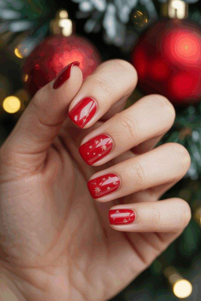 This style pairs bright red nails with a light touch of gold glitter. The glitter adds a festive shine without overpowering the red base.