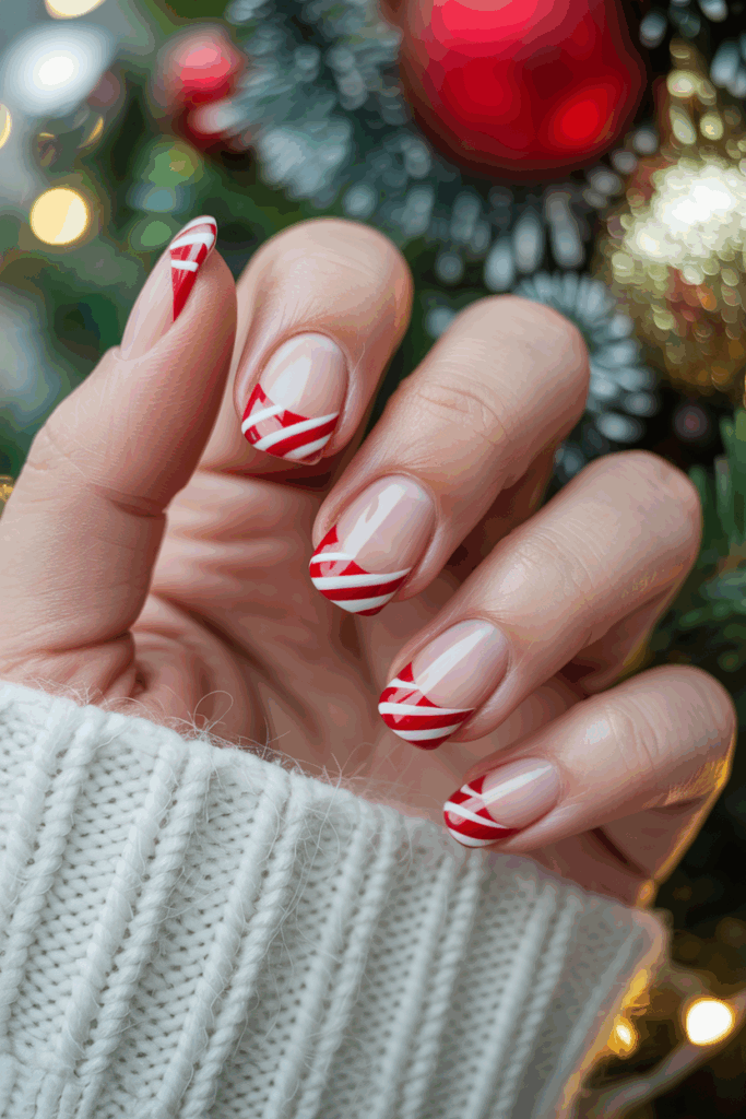 Candy cane stripe tips use red and white stripes for a classic holiday look. The design adds a festive touch without covering the whole nail.