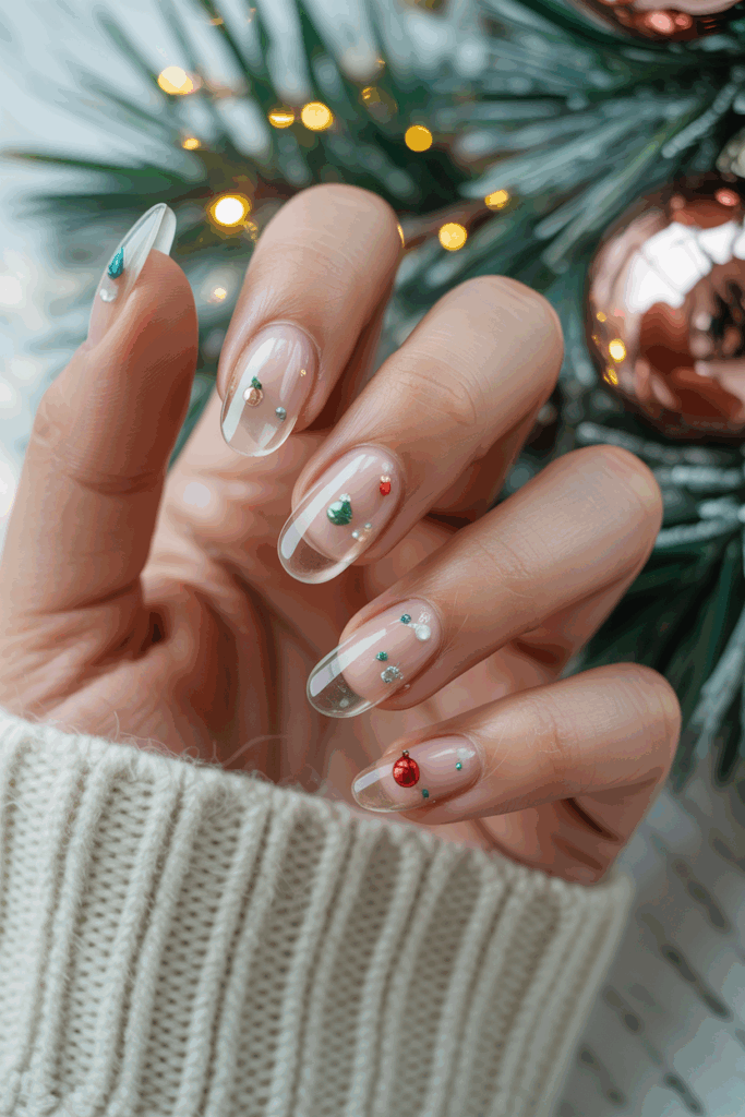 This design uses clear nail polish as the base. Small holiday-themed ornaments like stars, gifts, or snowflakes are embedded inside the nails.