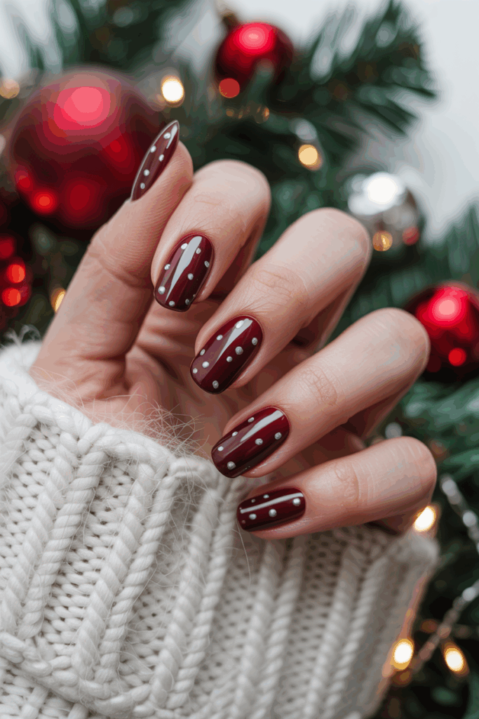 This design features a rich burgundy base color. Small silver dots are placed evenly across the nails.