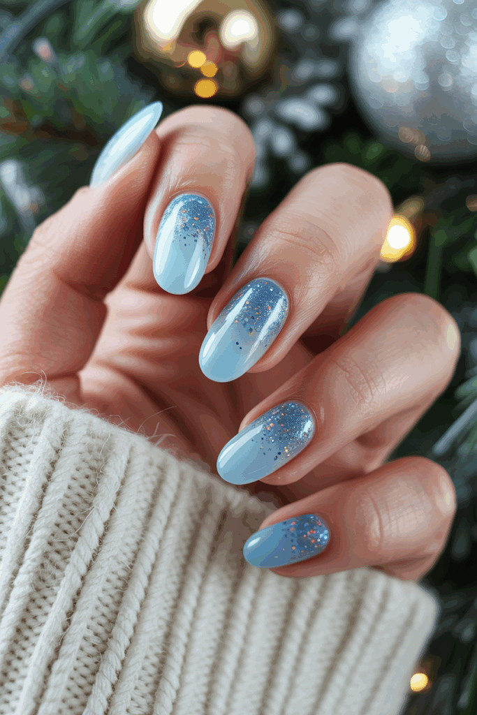 This design features a soft baby blue base. Glitter starts at the tips and fades gently downward. The silver sparkle adds a subtle, icy effect that fits the winter season well.