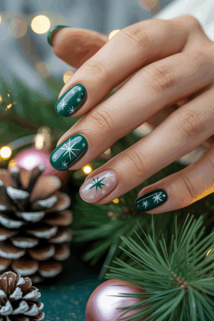 This design features a deep pine green base with a glossy finish. Small star details add a subtle festive touch without overwhelming the nails. It suits both casual and formal holiday events.