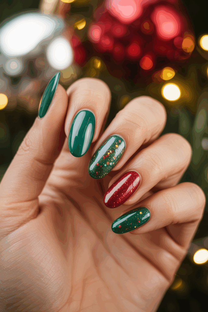 This design combines green and red glitter for a sparkling holiday look. The mix adds shine without being too bold. It works well for festive events or everyday wear during the season. The glitter catches light, giving nails a simple but festive touch.