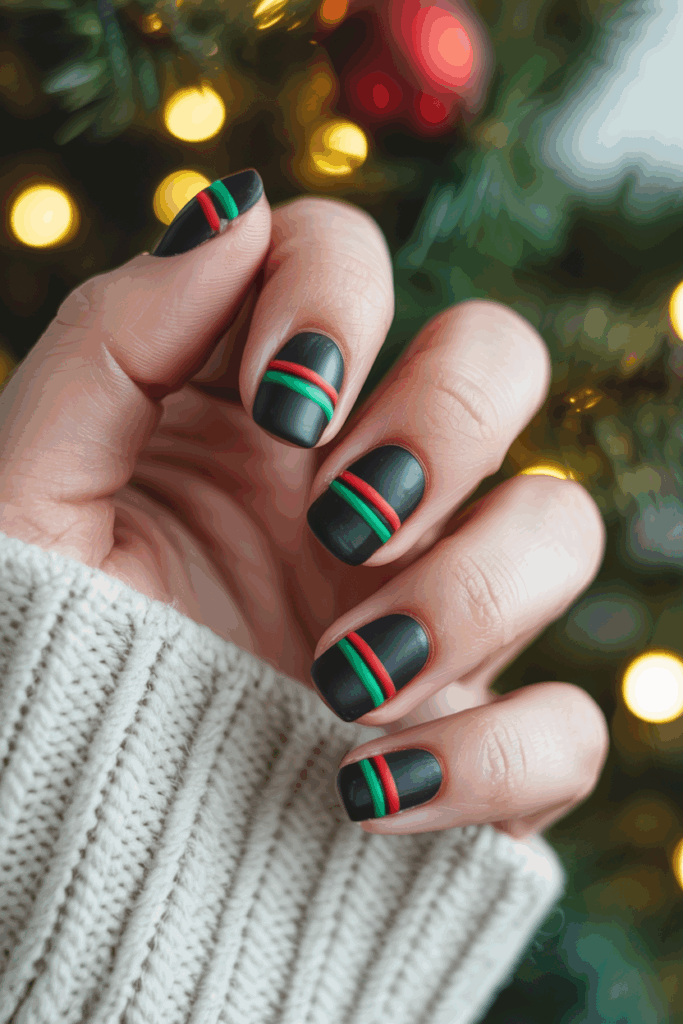This design pairs matte black nails with bold red and green stripes. The contrast creates a sharp and festive look. It works well for those wanting a simple yet stylish holiday design. The matte finish keeps the nails modern and elegant.