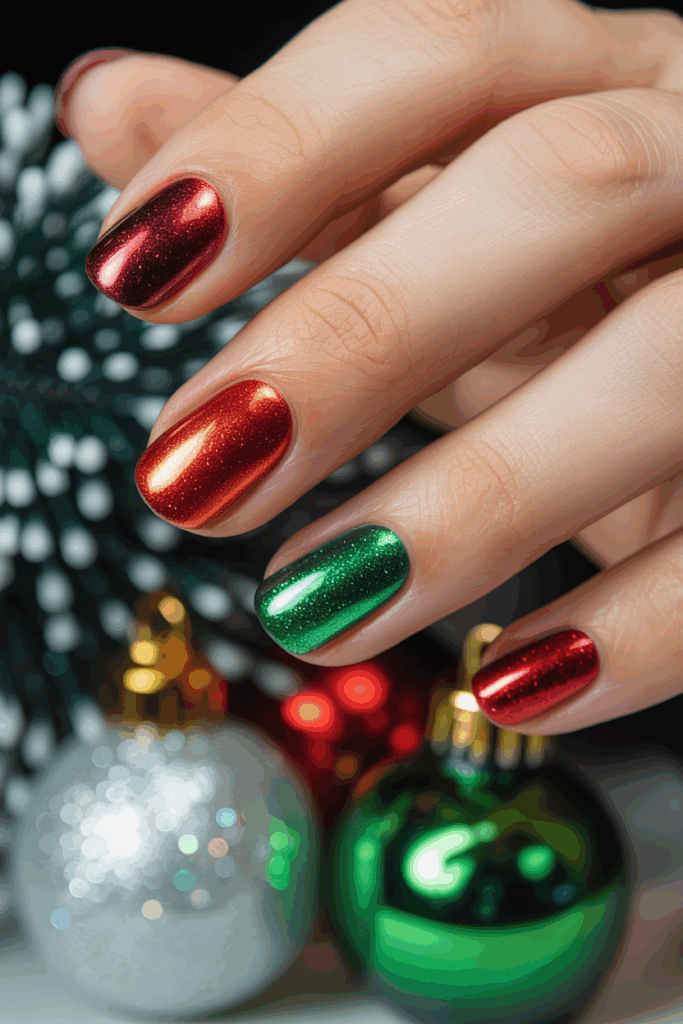 This style blends red and green colors in a smooth gradient. The metallic finish adds a shiny, reflective look. It creates a festive and elegant effect without being too busy. This design suits many holiday styles and works well for both casual and formal events.