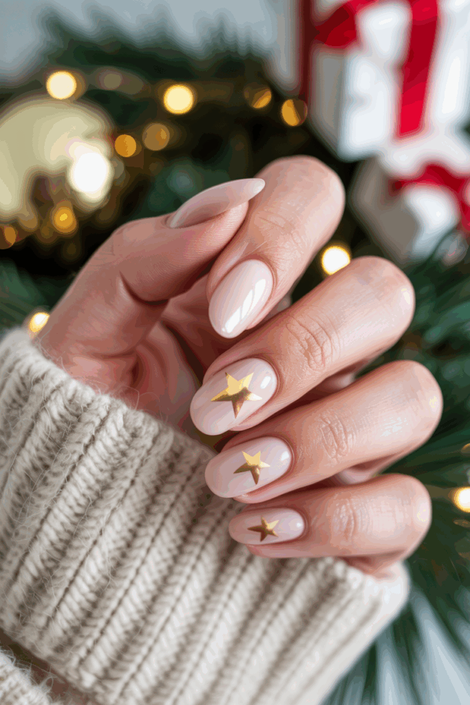 This design uses a soft nude base that looks natural and clean. A small gold star is placed on one nail as a subtle accent. It adds a festive touch without being too bold or flashy. The look is simple, elegant, and fits well with many styles.