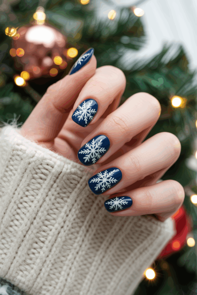 This style pairs deep navy blue nails with crisp white snowflake designs. The contrast highlights the delicate snowflakes clearly.