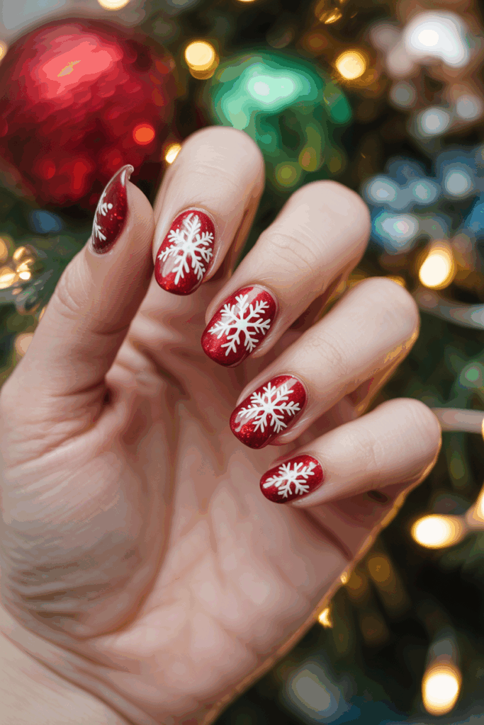 Red glitter snowflake nails offer a festive yet elegant look for the holidays. The deep red base shines with sparkling glitter, while white snowflake designs add a wintery touch. This style balances classic Christmas colors with a bit of sparkle for a polished finish.