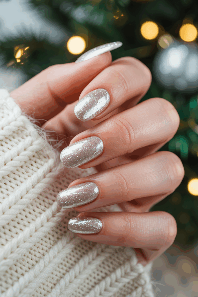 This style features nails fully covered in silver glitter polish. It gives a shiny, festive look perfect for holiday events.