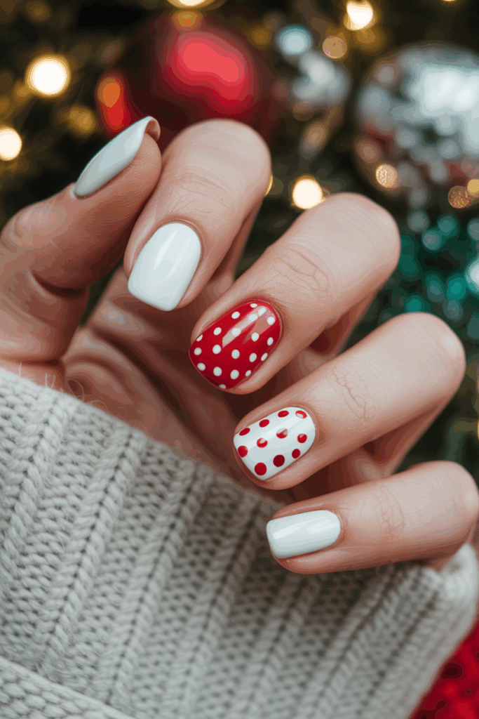 This design features a clean white base with small red polka dots. The contrast creates a festive and playful look. It works well for those who want a simple but stylish holiday nail. The red dots add just the right amount of color without being too bold.