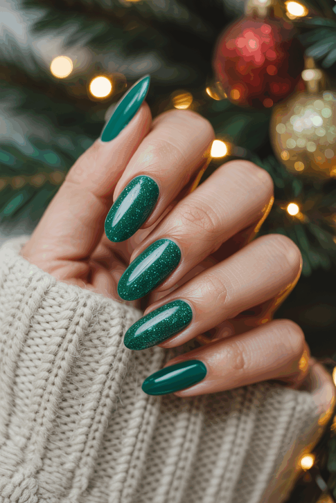 Deep burgundy nails offer a rich and classic look for winter. Adding a fine, subtle sparkle along the edges creates a refined, festive touch without being overwhelming. This style works well for both casual days and holiday events.