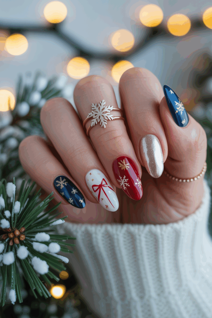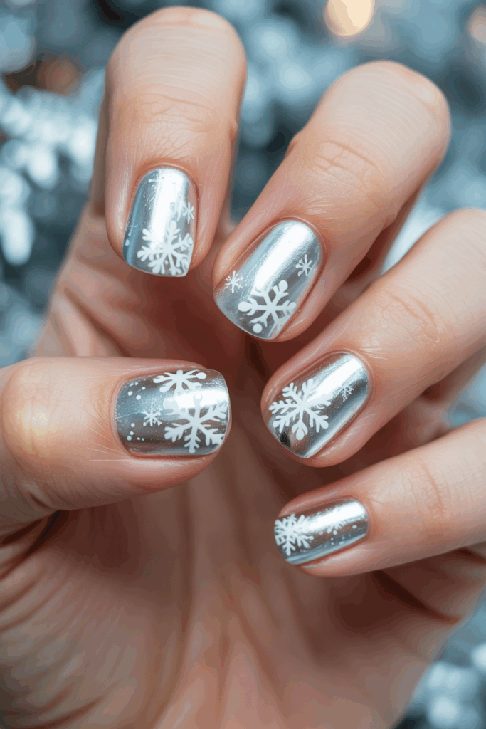 Metallic silver nails create a sleek, festive base. Adding snowflake decals brings a wintery touch without extra effort.