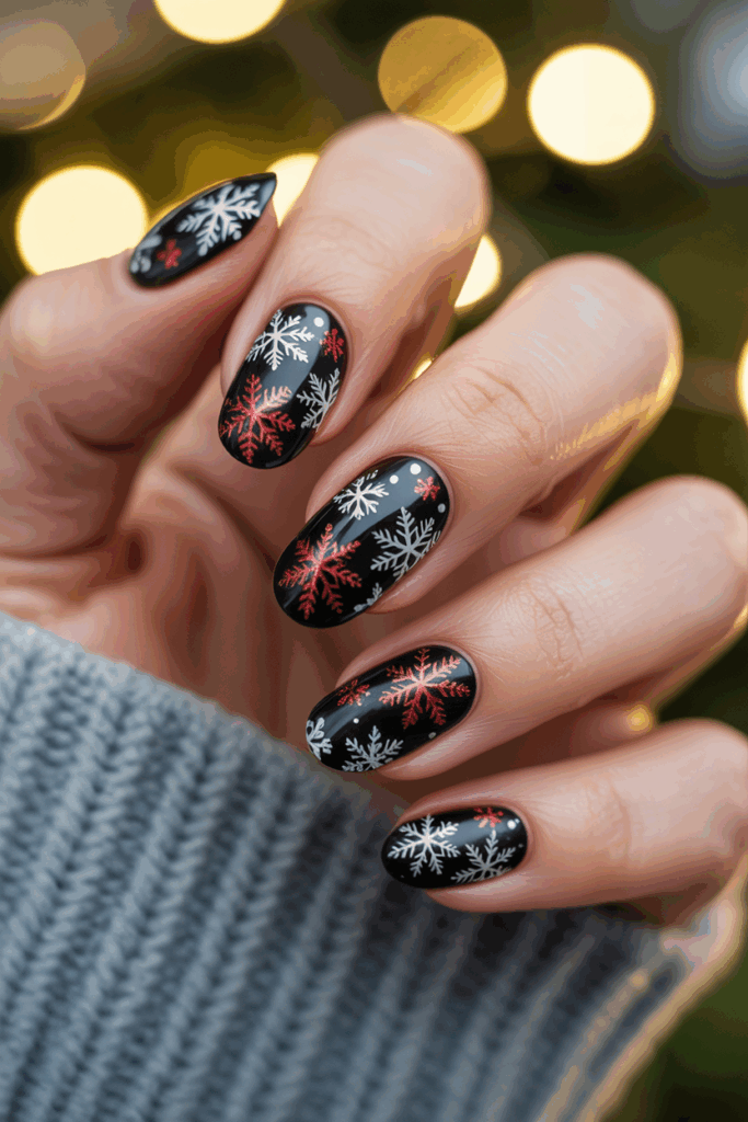 This nail design uses a shiny black base for a sleek look. Small pieces of red and gold foil are added for a festive touch. The foil catches the light and adds a bit of sparkle without overwhelming the nails. It works well for holiday parties or winter events.