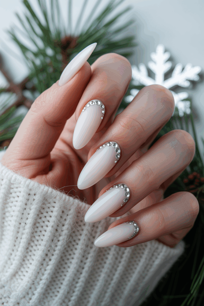 Matte white nails create a smooth, soft base that feels modern and clean. Adding silver rhinestones brings a touch of shine without being too flashy. This look balances simplicity and festive sparkle, perfect for winter celebrations. It works well for both casual and formal holiday events.