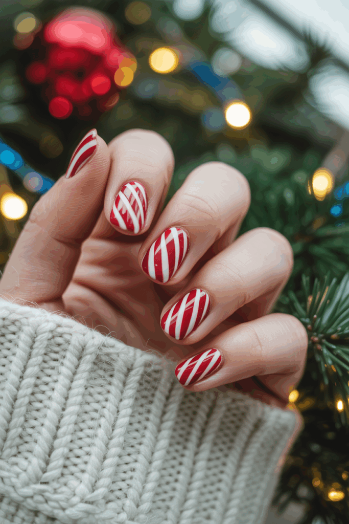 Candy cane striped nails mix red and white stripes to create a simple, festive look. This style suits winter celebrations and adds a classic holiday touch. It can be worn with or without glitter for extra sparkle.