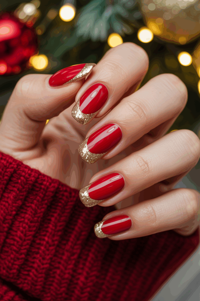 This design combines a bold red base with gold glitter on the tips. It offers a simple, festive look that fits the holiday season. The gold glitter adds just enough sparkle without being too flashy. It works well for both casual and formal occasions.