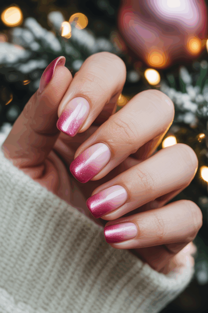 Frosted pink ombre nails blend soft pink shades with a light, icy finish. This look creates a smooth color fade that feels both delicate and festive. It works well for holiday events, adding a subtle but stylish touch. The frosted effect gives nails a cool, winter-ready shine.