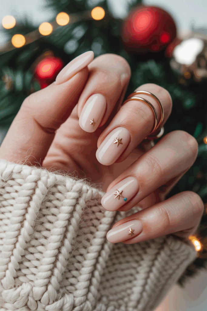 This design features a smooth, glossy nude base that looks clean and elegant. Tiny star embellishments add a subtle festive touch without being too bold. It works well for those who want a simple yet stylish winter nail look.