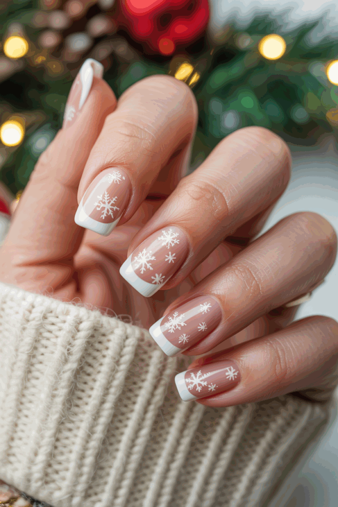 This design uses soft, neutral colors as the base, creating a calm and elegant look. Tiny snowflakes are painted delicately on the French tips, adding a winter touch without being too bold. The style works well for both casual and formal occasions during the holiday season.