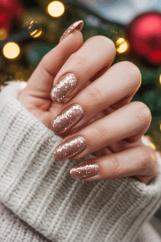 This look uses a full coat of rose gold glitter on all nails. It creates a shiny, festive effect perfect for winter holidays.